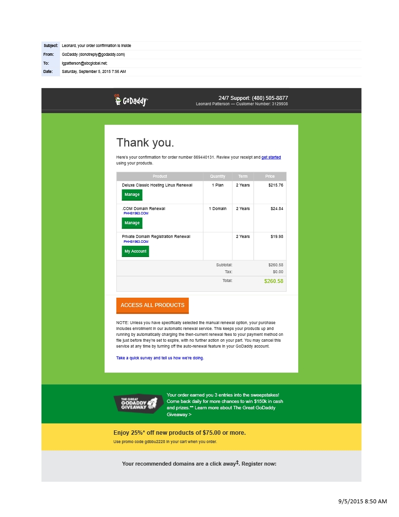 09/05/2015: | | Renew website Domain Registration/ Web Hosting for 2 years, Expires Aug. 21, 2018! |